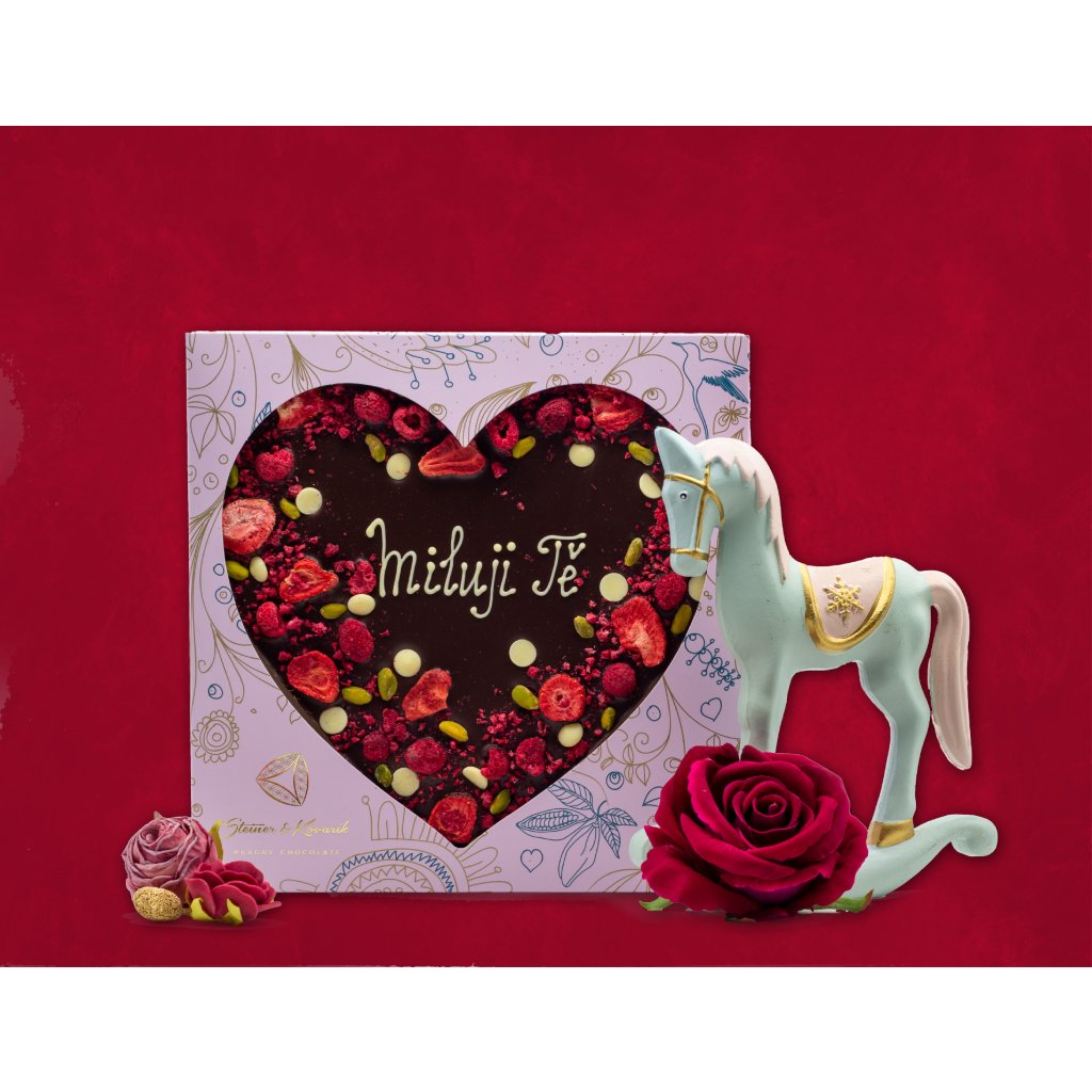 Hořká čokoláda, jako naprostá klasika, tvoří základ pro toto půlkilové srdce. Provoní vám interiér, naladí vaše smysly a na jazyku se jen rozplývá. Vytvořit z ní velký symbol lásky byla snadná volba a spojením s lyofilizovaným posypem se dotvořilo romantické vyznání.