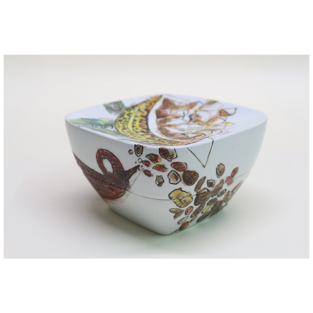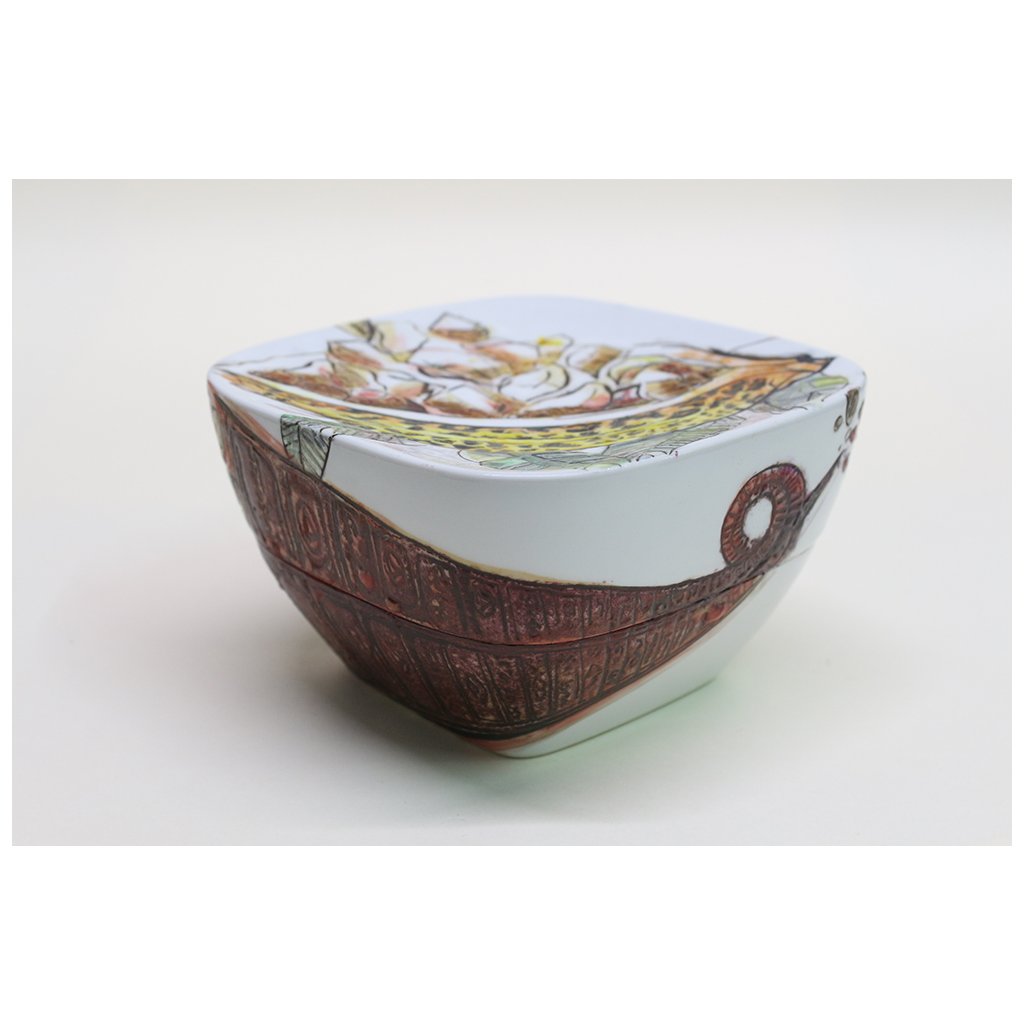 Technique: The can is drawn with a pencil on the so-called overheat (800 ˚C), then the contour is painted with fusible paint and cobalt and colored with metal chlorides - salts. Glazing was followed by firing at 1400˚C. All other tones on this object are so-called surface colors and listers. Burns vary according to shades. Blue, violet and green tones are fired at 820 ˚C, brown, rust and ocher at 780 ˚C, and 750 ˚C is used for red crimson, pink and sometimes light orange tones. All these tones appear in the sum as azure, i.e. transparent, and add up to the underpainting of metal chlorides. This can has been fired four times. In no case is this so-called French porcelain fired only at 1,200˚C.