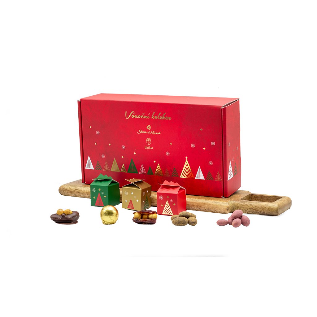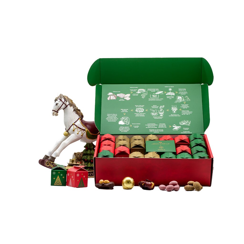 Tradiční vánoční kolekce v našem stylu. Máme pro vás 24 krásných papírových domečků v tradičních svátečních barvách, které ozdobí váš vánoční stromeček. V domečcích najdete různé čokoládové sladkosti z naší dílny: mandličky, pomeranč, šťavnaté datle, piemontské lískové oříšky – to vše obalené ve výborné kvalitní čokoládě. A nesmí chybět náš klenot, pralinky Karlovy koule.