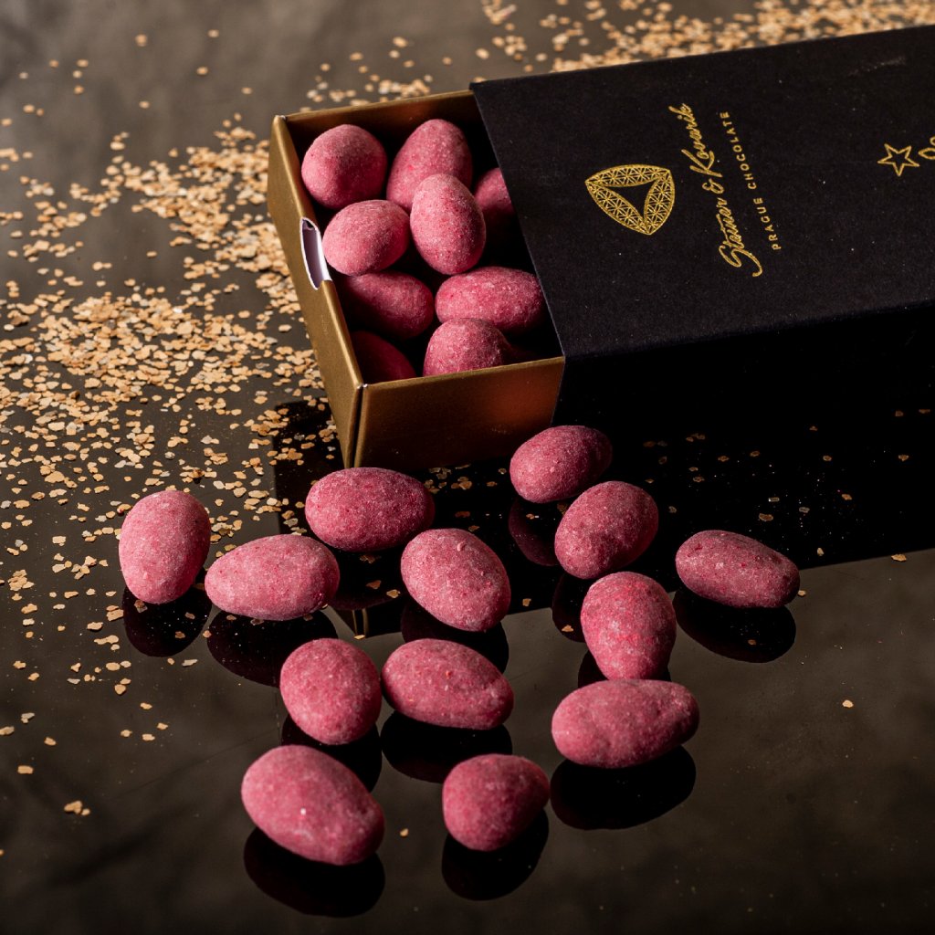 Vánoční mandle v ruby čokoládě a malinovém prachu, 130g